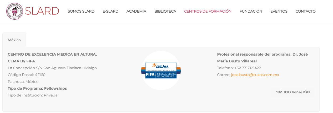 Hospital CEMA ha sido reconocido por la Sociedad Latinoamericana de Artroscopía, Reconstrucción Articular, y Trauma Deportivo (SLARD) como centro de formación oficial, gracias a la gestión del Dr. José María Busto Villarreal, jefe del Servicio de Cirugía Articular y Traumatología del Deporte y profesor titular del Curso de Alta Especialidad en esta disciplina.